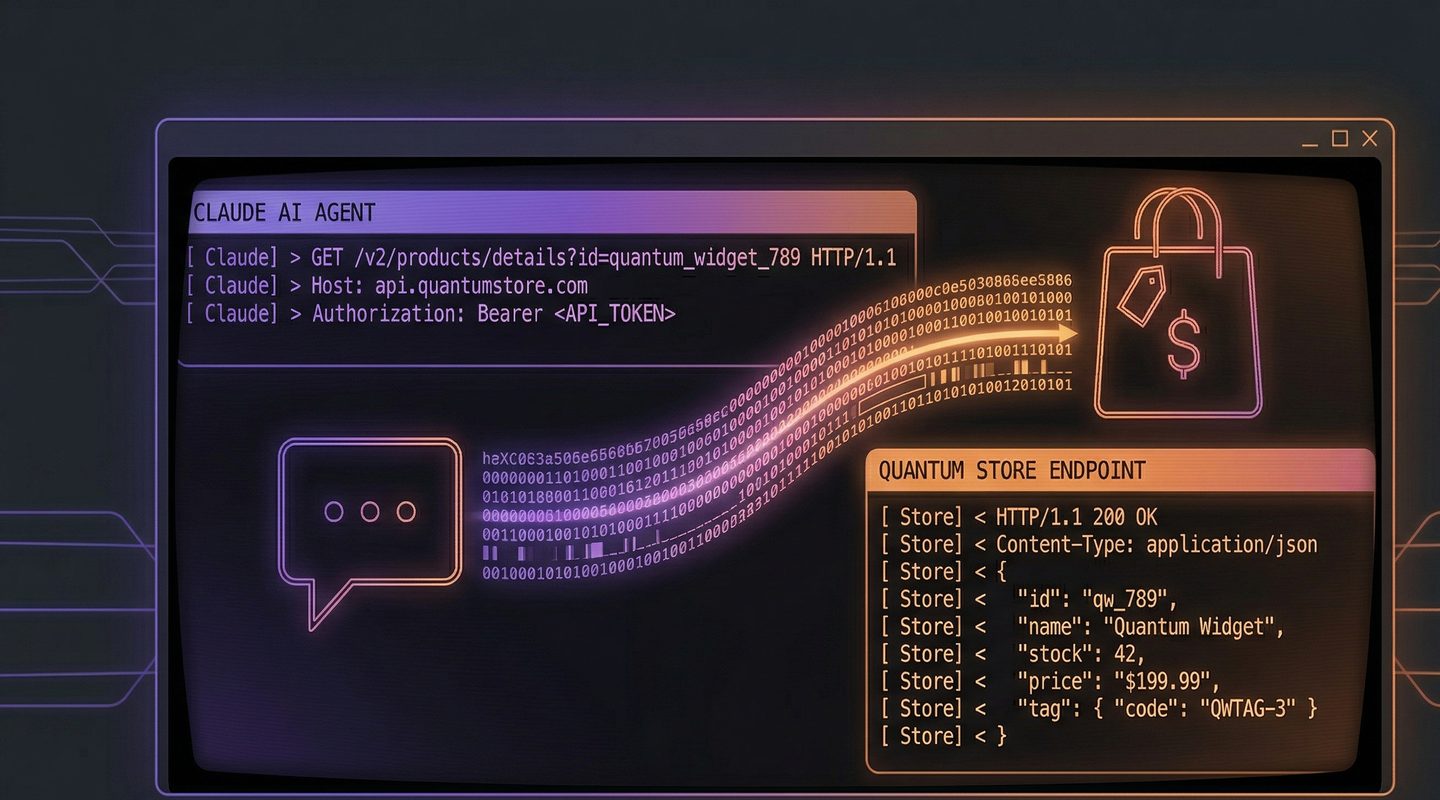 The agent is external. The commerce platform is the data source and the execution target. That boundary is not negotiable.