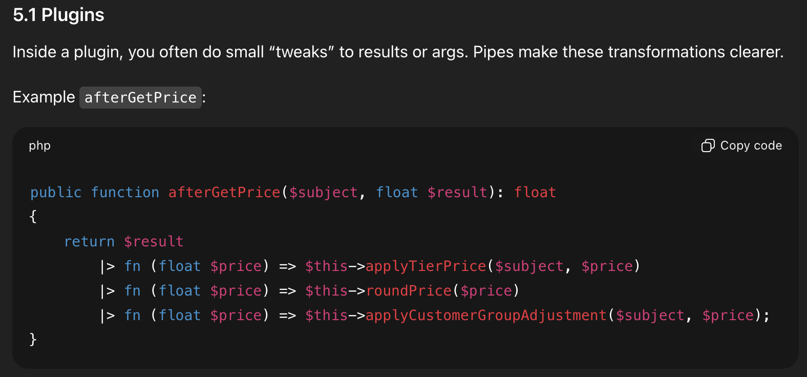 It doesn’t give you new superpowers, but it makes a ton of existing Magento patterns cleaner and easier to read—especially anything that looks like “take this value, transform it, transform it again, transform it again…”.