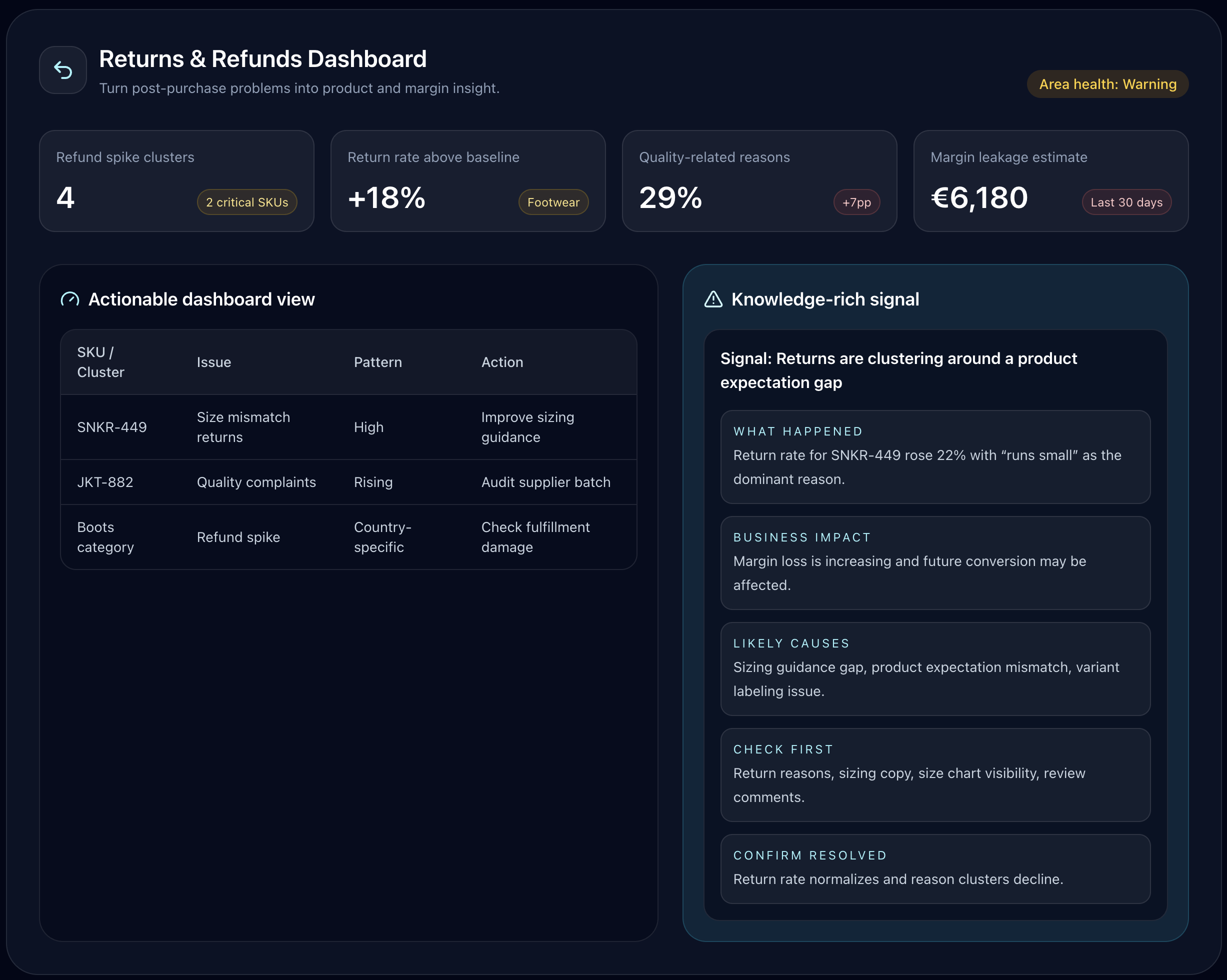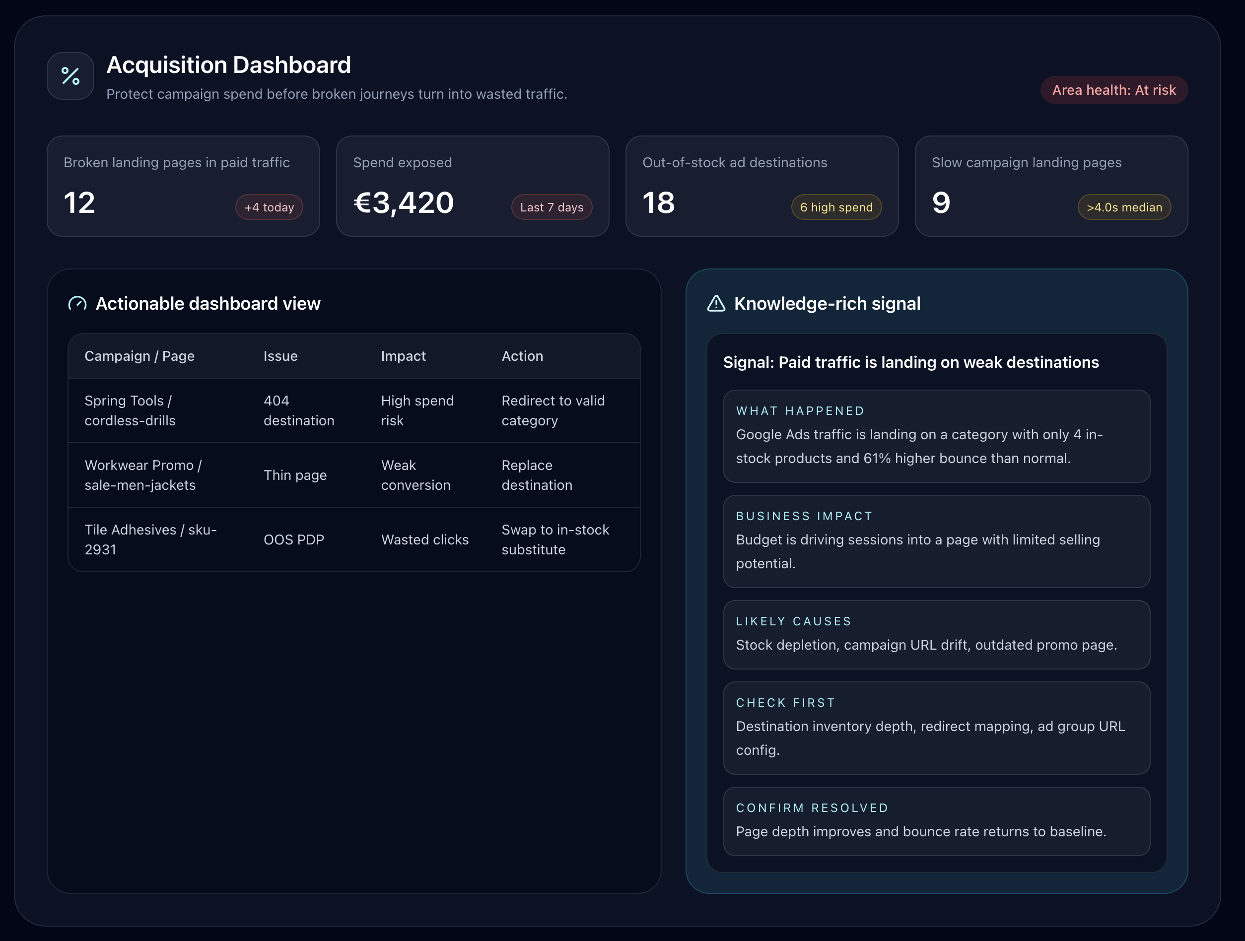 StoreSignals helps merchants detect issues across acquisition, catalog, search, PDP, cart, checkout, orders, fulfillment, and returns — then explains what to do next. It is not just monitoring. It is operational knowledge, automated.