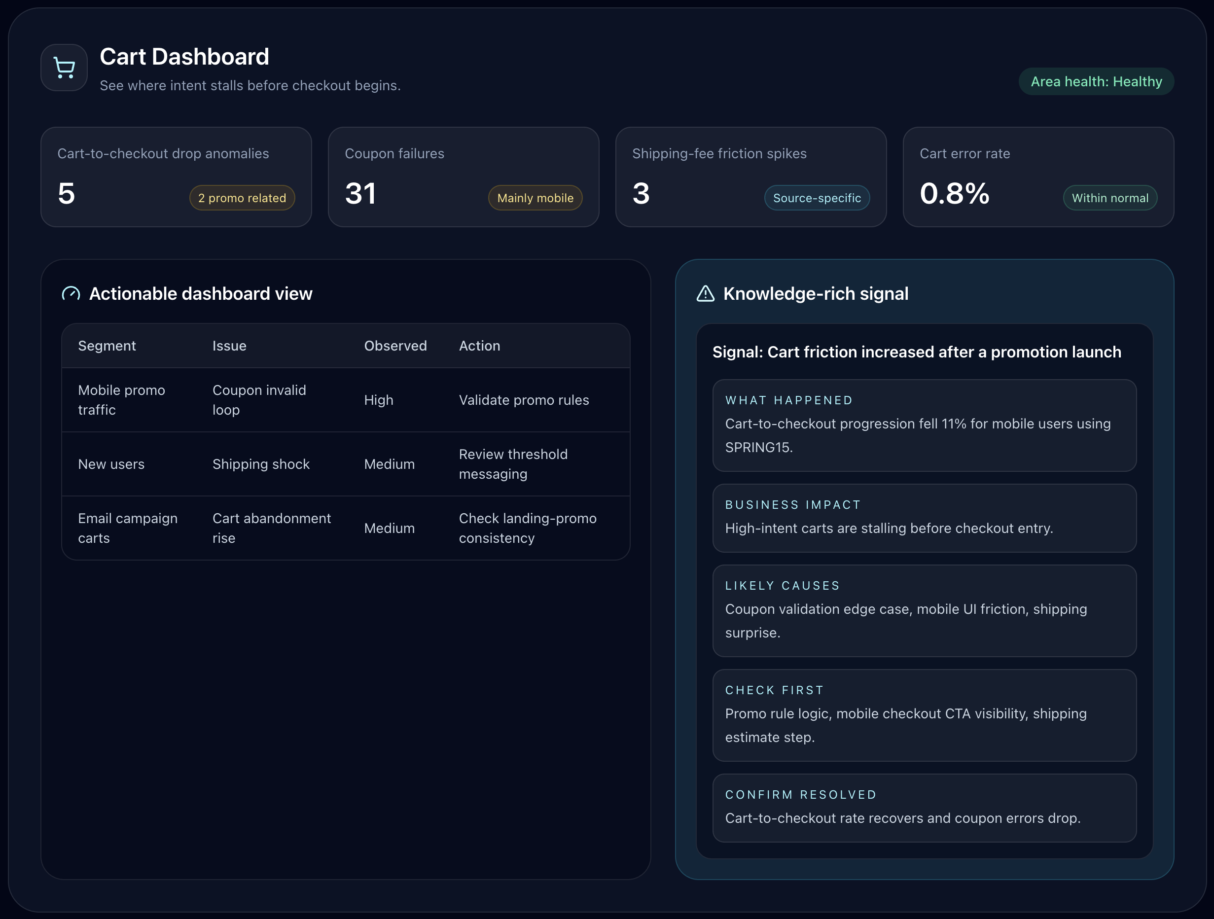 Detect cart-to-checkout drop anomalies, coupon failures, shipping-fee friction spikes, and cart error rates that stall high-intent sessions.