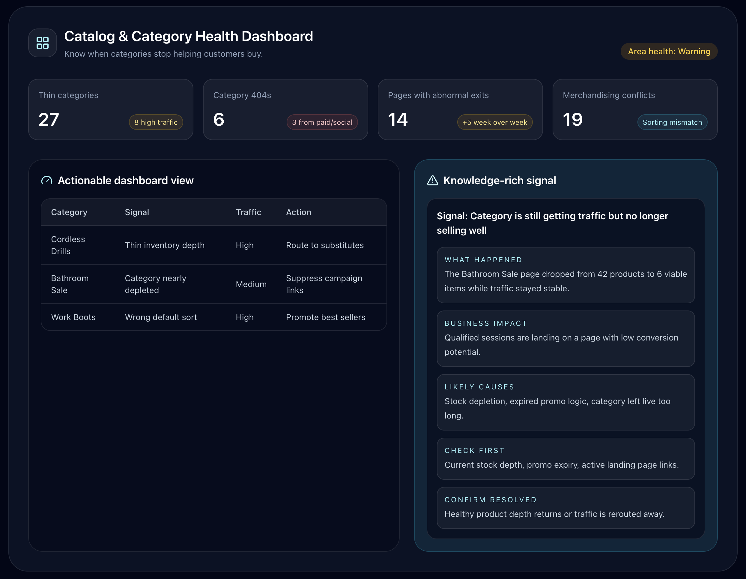 Track thin categories, depleted landing pages, hidden 404s, sort-order problems, weak category depth, and pages that quietly turn high-intent traffic into exits.