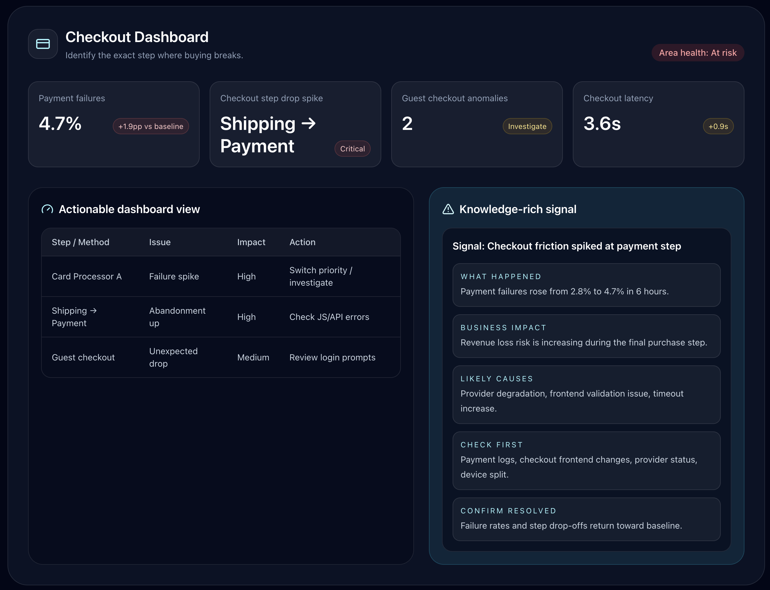 Identify the exact step where checkout fails. Detect payment failures, checkout step drop spikes, guest checkout anomalies, and checkout latency issues.