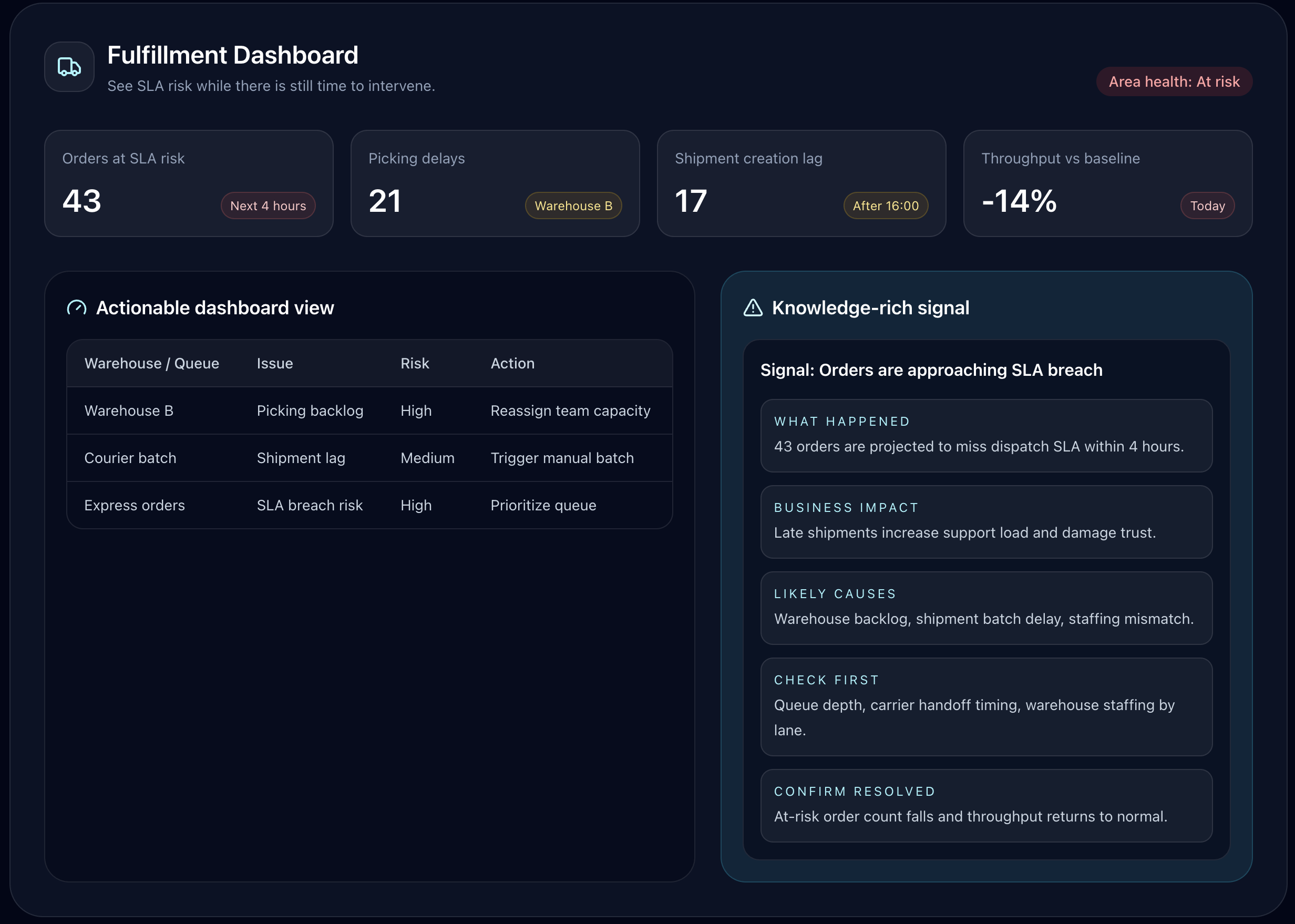 Flag SLA risk before breach, delayed picking and packing, warehouse bottlenecks, and shipment lag while there is still time to intervene.