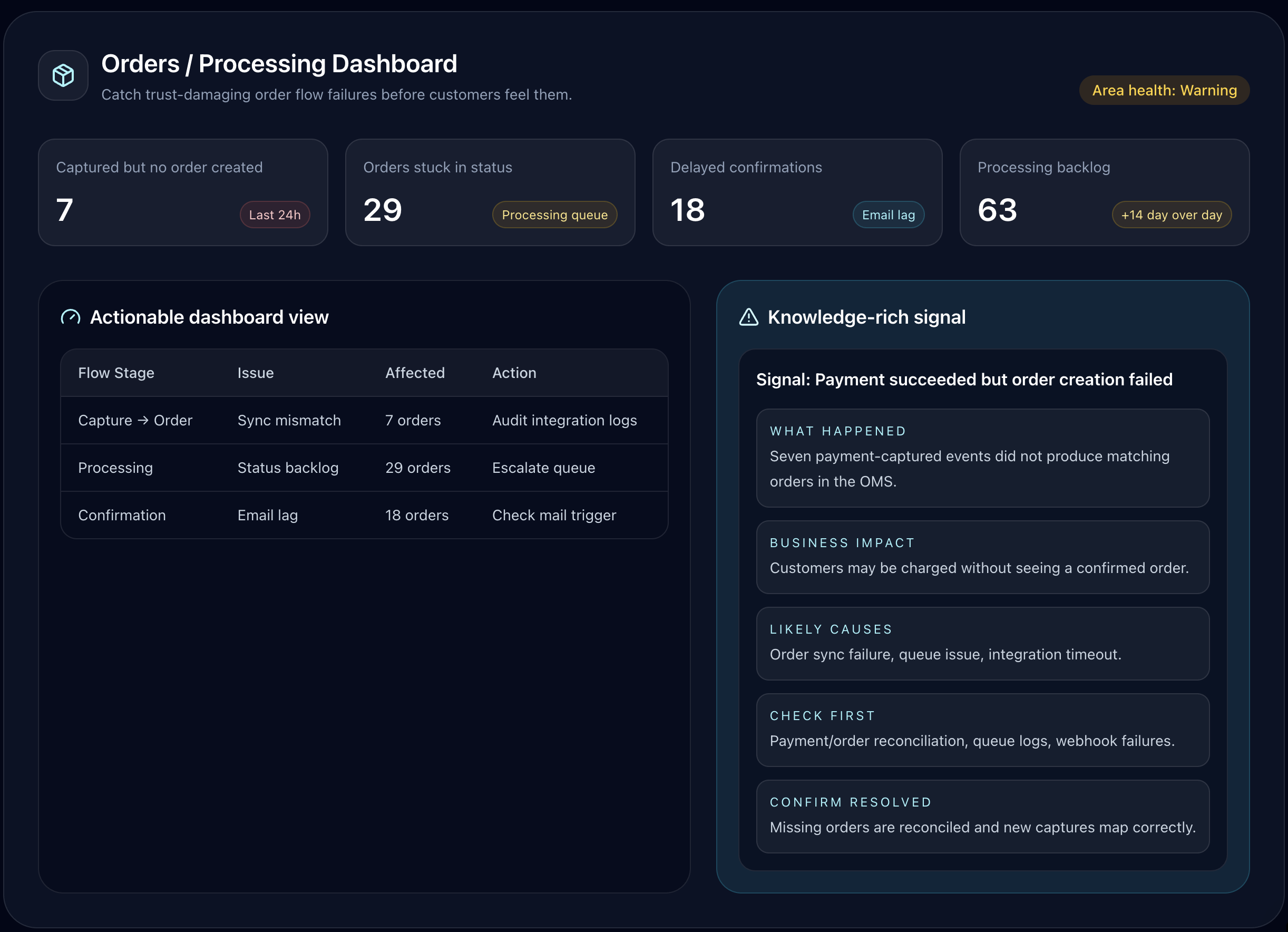 Spot payment-captured-but-order-not-created incidents, stuck statuses, unprocessed orders, and operational delays before customers start writing in.