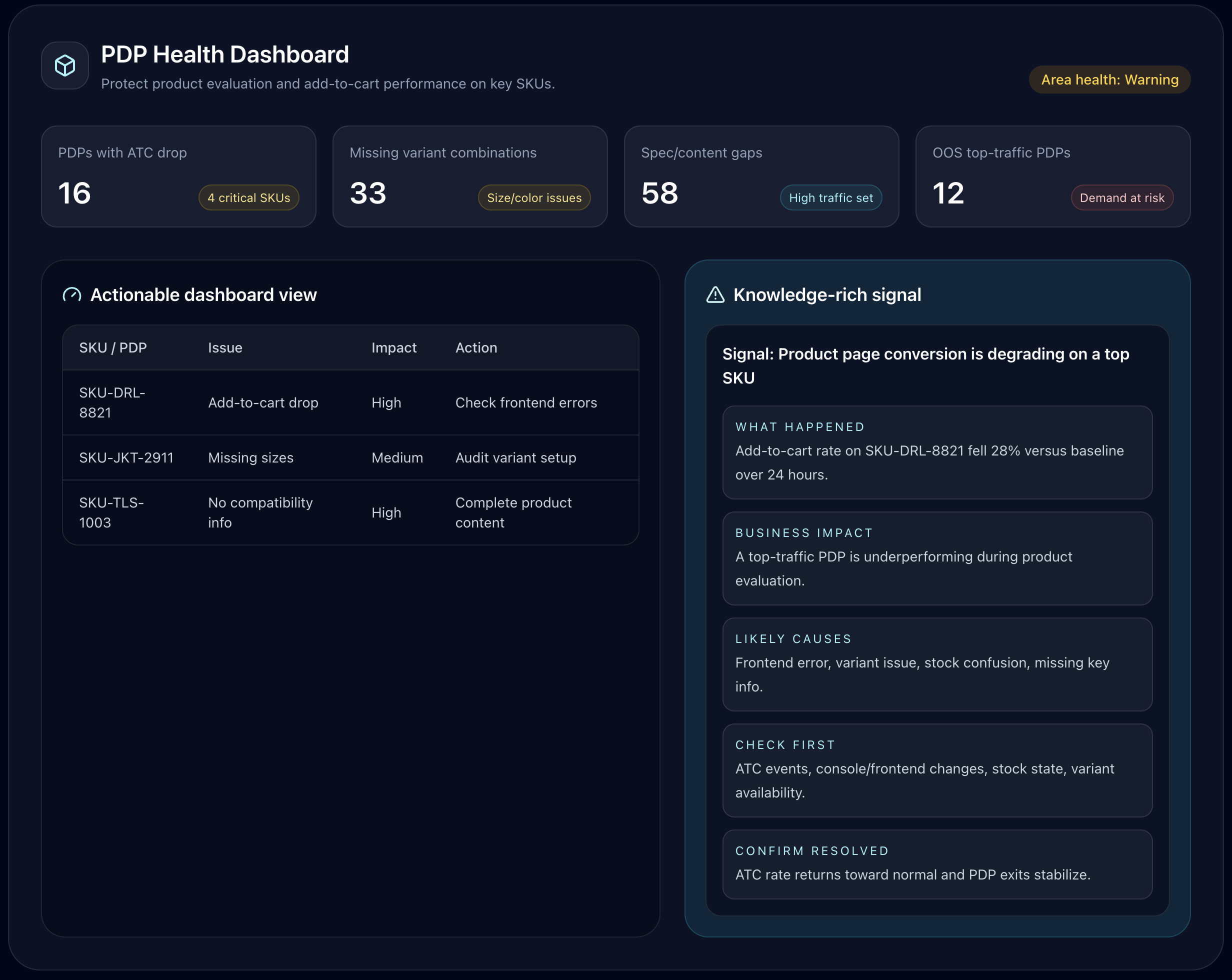Built for operators who need to know what needs attention now inside Catalog, Search, Checkout, Orders, or Fulfillment.