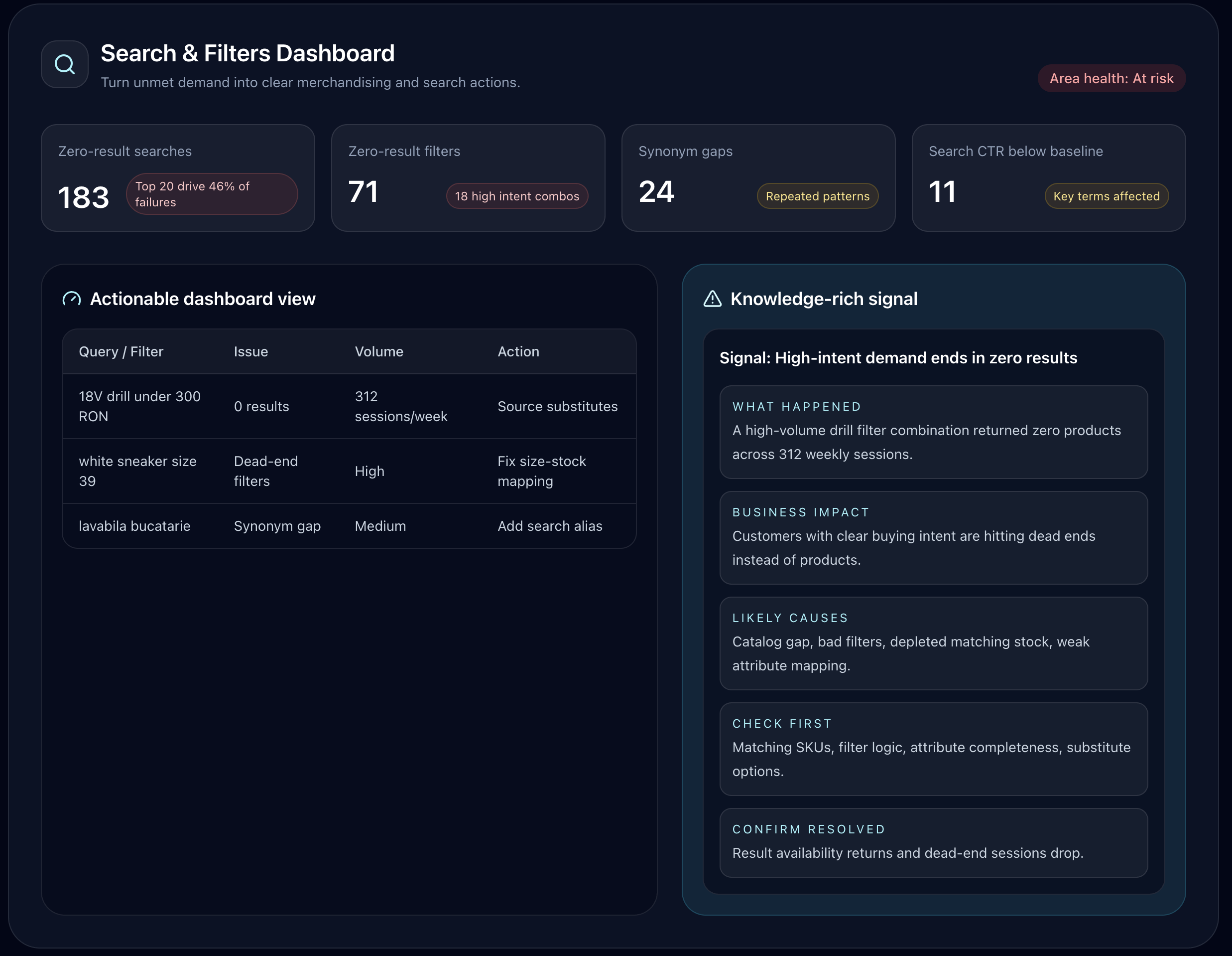 Turn zero-result searches, failed filter combinations, synonym gaps, and language mismatches into recommended merchandising and search actions.